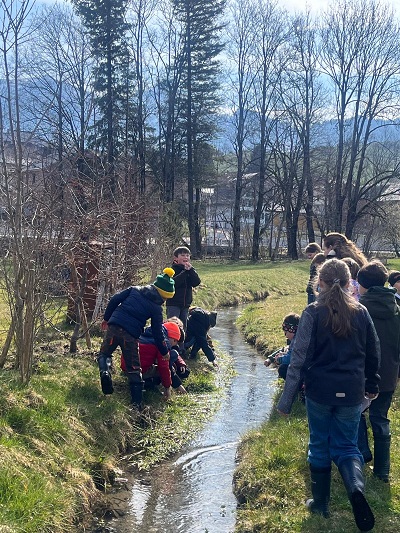 Passend zu unserem NMG-Thema "Amphibien" ziehen wir im Schulzimmer Kaulquappen gross. Zuerst holten wir uns im nahegelegenen Bächli 20 Froscheier sowie genug Bachwasser für das Aquarium.