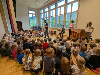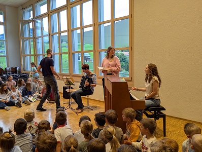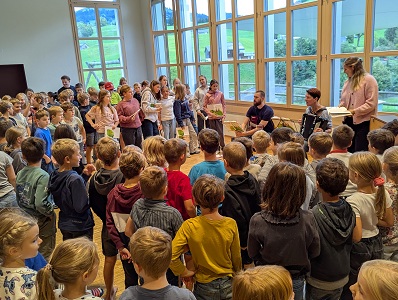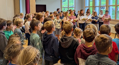 Seit September dieses Jahres finden sich alle Kinder der Schule Schwende jeden Freitagmorgen zum gemeinsamen Singen auf der Bühne ein. Gesungen werden schöne und auch lustige Appenzeller Lieder. Begleitet wird das Ganze instrumental durch drei Lehrpersonen und der Kinderchor wird von Sarah Stäger kompetent geführt. Mit diesem musikalischen Einstieg lässt sich der letzte Schultag der Woche jeweils sehr gut starten😀.